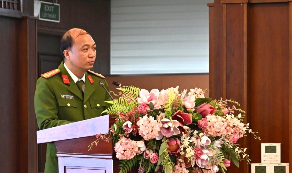 Đồng chí Thượng tá Nguyễn Hùng Quân, Phó Trưởng phòng Cục Cảnh sát Hình sự phát biểu tại Hội nghị