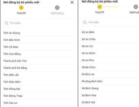 Nhấn vào "Nơi đăng ký bỏ phiếu mới", hệ thống hiển thị màn chọn địa chỉ