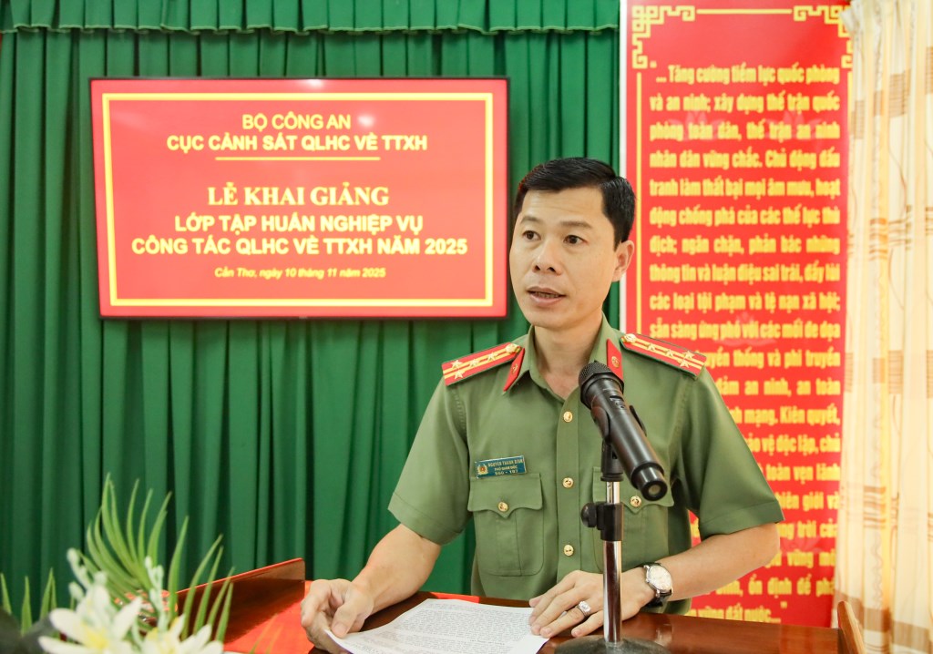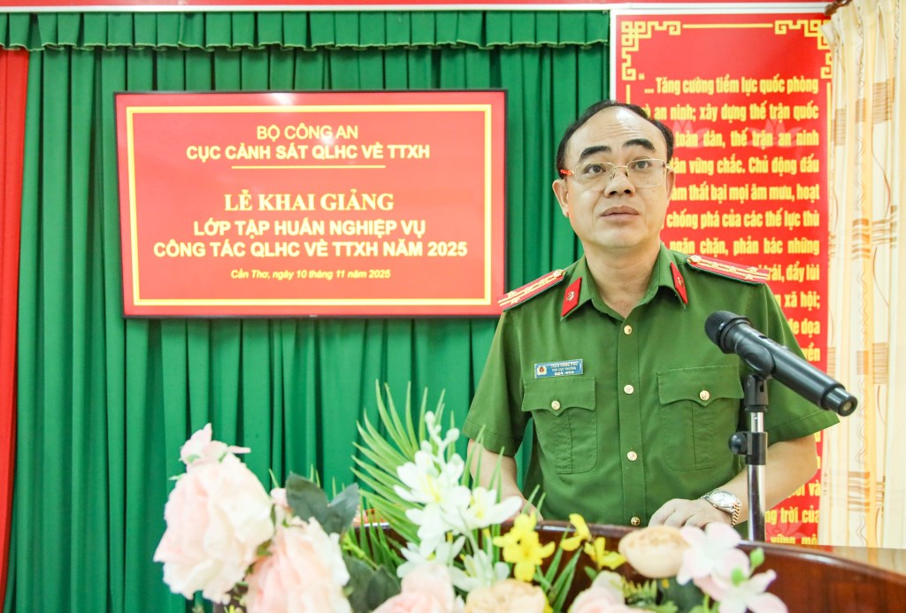 Ngày 10/11/2025, tại thành phố Cần Thơ, Cục Cảnh sát QLHC về TTXH, Bộ Công an, tổ chức Khai giảng lớp tập huấn nghiệp vụ công tác QLHC về TTXH năm 2025. Tới dự lễ khai mạc và chủ trì có đồng chí Đại tá Trần Hồng Phú, Phó Cục trưởng Cục Cảnh sát QLHC về TTXH; về phía công an thành phố Cần Thơ có đồng chí Đại tá Nguyễn Thanh Bình, Phó Giám đốc Công an thành phố Cần Thơ cùng sự tham gia của đại diện các Phòng nghiệp vụ PX03, PV01, PH10, PC06 Công an TP. Cần Thơ; các đồng chí Báo cáo viên, lãnh đạo và các bộ chiến sỹ Cục Cảnh sát QLHC về TTXH và 340 học viên tham gia lớp tập huấn.