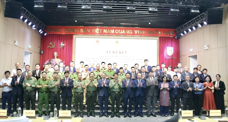 Bộ trưởng Bộ Công an Lương Tam Quang, Bộ trưởng Bộ Tư pháp Nguyễn Hải Ninh và Bộ trưởng Bộ Khoa học và Công nghệ Nguyễn Mạnh Hùng cùng các đại biểu tham dự lễ ký kết