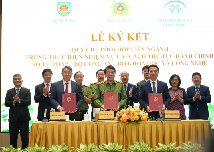 Bộ trưởng Bộ Công an Lương Tam Quang, Bộ trưởng Bộ Tư pháp Nguyễn Hải Ninh và Bộ trưởng Bộ Khoa học và Công nghệ Nguyễn Mạnh Hùng ký kết quy chế phối hợp liên ngành