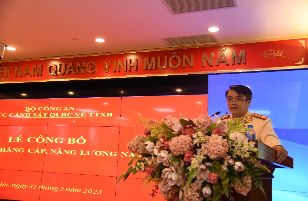 Ngày 31/5/2023, tại Hà Nội, Cục Cảnh sát Quản lý hành chính về trật tự xã hội (QLHC về TTXH) long trọng tổ chức Lễ công bố Quyết định của Bộ trưởng Bộ Công an và Quyết định của Cục trưởng Cục Cảnh sát QLHC về TTXH về thăng cấp, nâng lương năm 2023. Dự và chỉ đạo buổi Lễ có đồng chí Đại tá Ngô Như Cường, Phó Cục trưởng Cục Cảnh sát QLHC về TTXH; đại diện Lãnh đạo các Phòng, Trung tâm và 69 đồng chí được thăng cấp bậc hàm, nâng lương năm 2023.