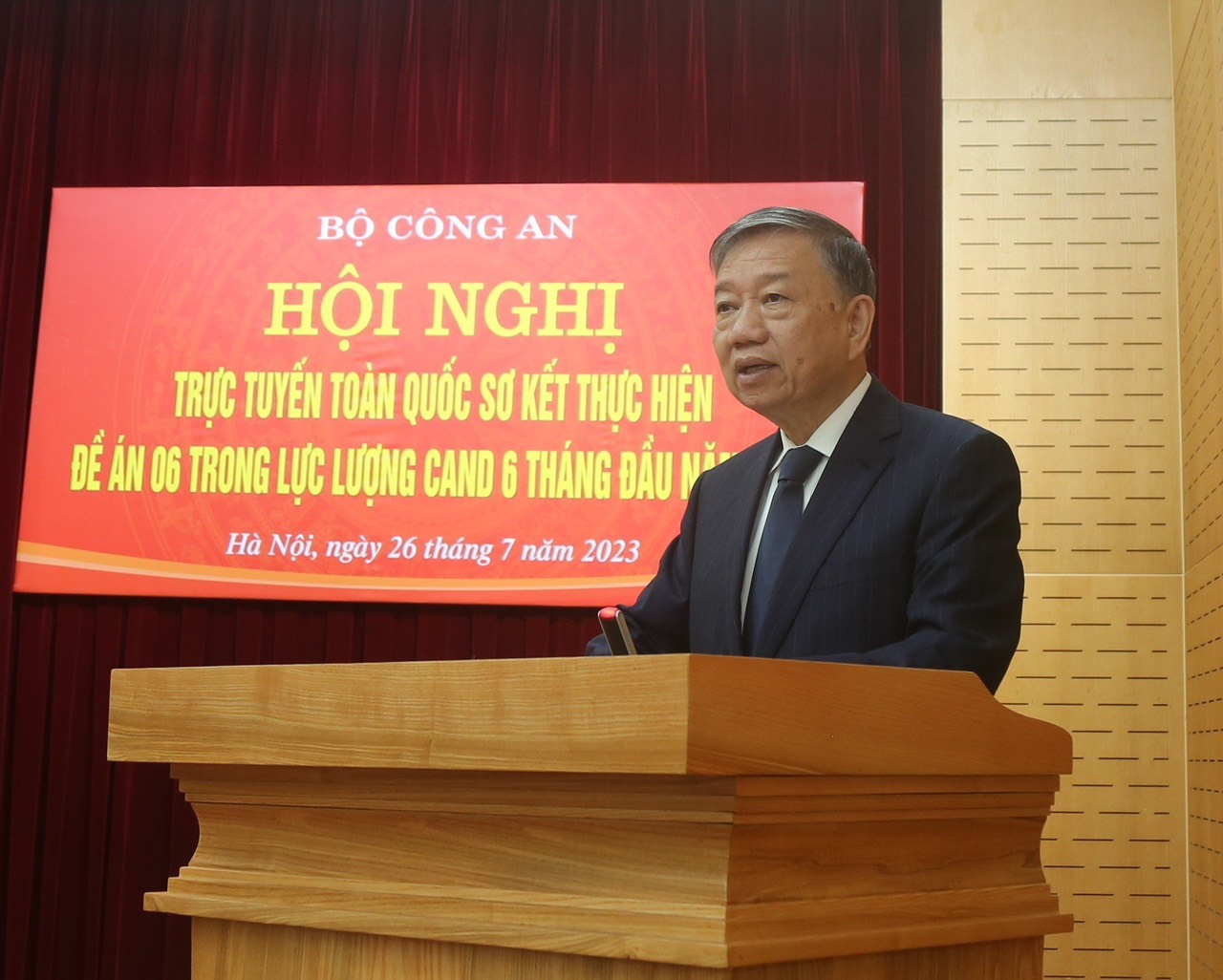 Sáng 26/7/2023, tại Hà Nội, Bộ Công an đã tổ chức Hội nghị trực tuyến toàn quốc sơ kết thực hiện Đề án 06 trong lực lượng Công an nhân dân 6 tháng đầu năm 2023. Đồng chí Đại tướng Tô Lâm, Ủy viên Bộ Chính trị, Bộ trưởng Bộ Công an, Trưởng Ban chỉ đạo Đề án 06 của Bộ Công an chủ trì Hội nghị.