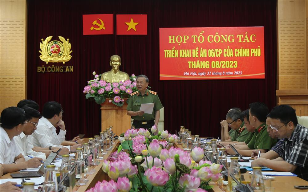 Ngày 31/8/2023, tại Hà Nội, Đại tướng Tô Lâm, Uỷ viên Bộ Chính trị, Bộ trưởng Bộ Công an, Tổ trưởng Tổ công tác triển khai Đề án phát triển ứng dụng dữ liệu về dân cư, định danh và xác thực điện tử phục vụ chuyển đổi số quốc gia giai đoạn 2022-2025, tầm nhìn đến năm 2030 của Chính phủ (Đề án 06) đã chủ trì cuộc họp Tổ công tác triển khai Đề án 06 tháng 8/2023.