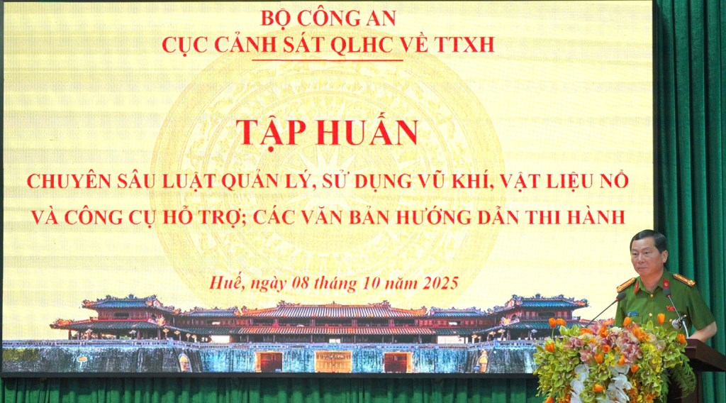 Sáng ngày 08/10/2025, Cục Cảnh sát Quản lý hành chính về trật tự xã hội phối hợp với Công an thành phố Huế tổ chức tập huấn chuyên sâu Luật Quản lý, sử dụng vũ khí, vật liệu nổ và công cụ hỗ trợ và các văn bản hướng dẫn thi hành cho lãnh đạo, chỉ huy, cán bộ, chiến sỹ Công an các địa phương.